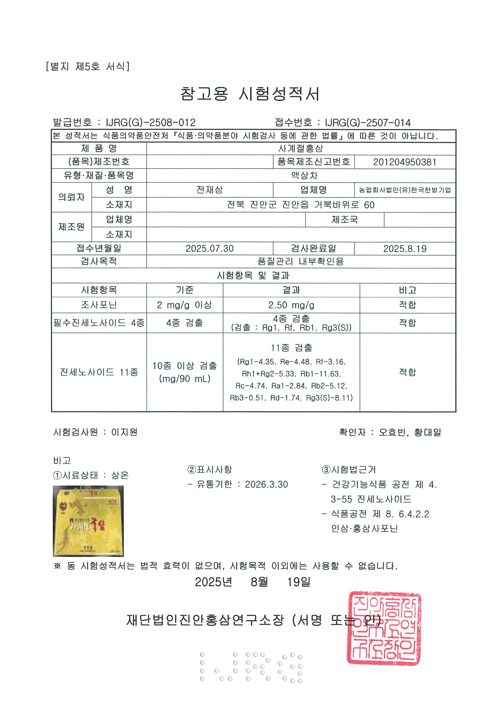 2025. 사계절 홍삼 참고용 시험성적서(진안홍삼연구소 검사)