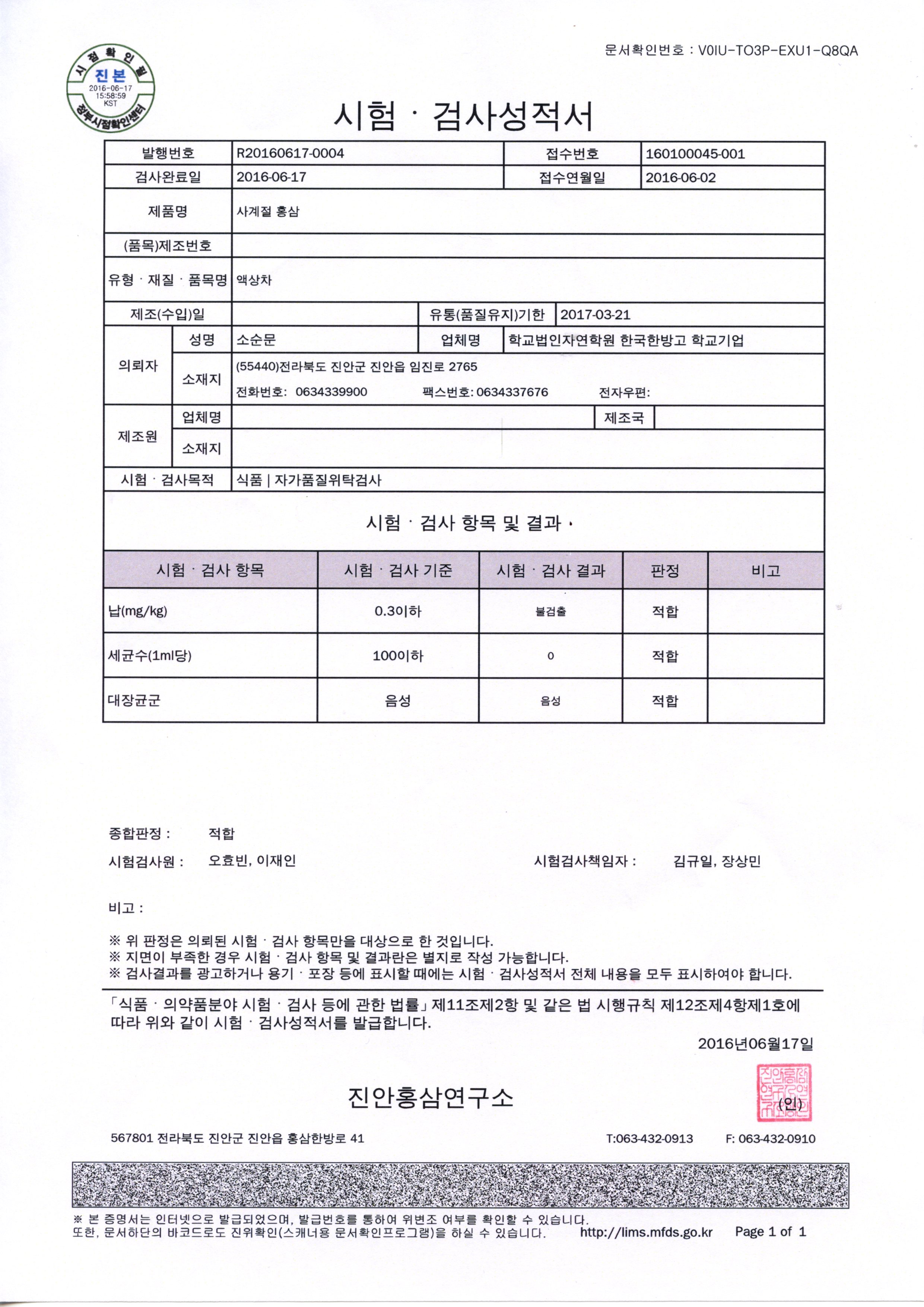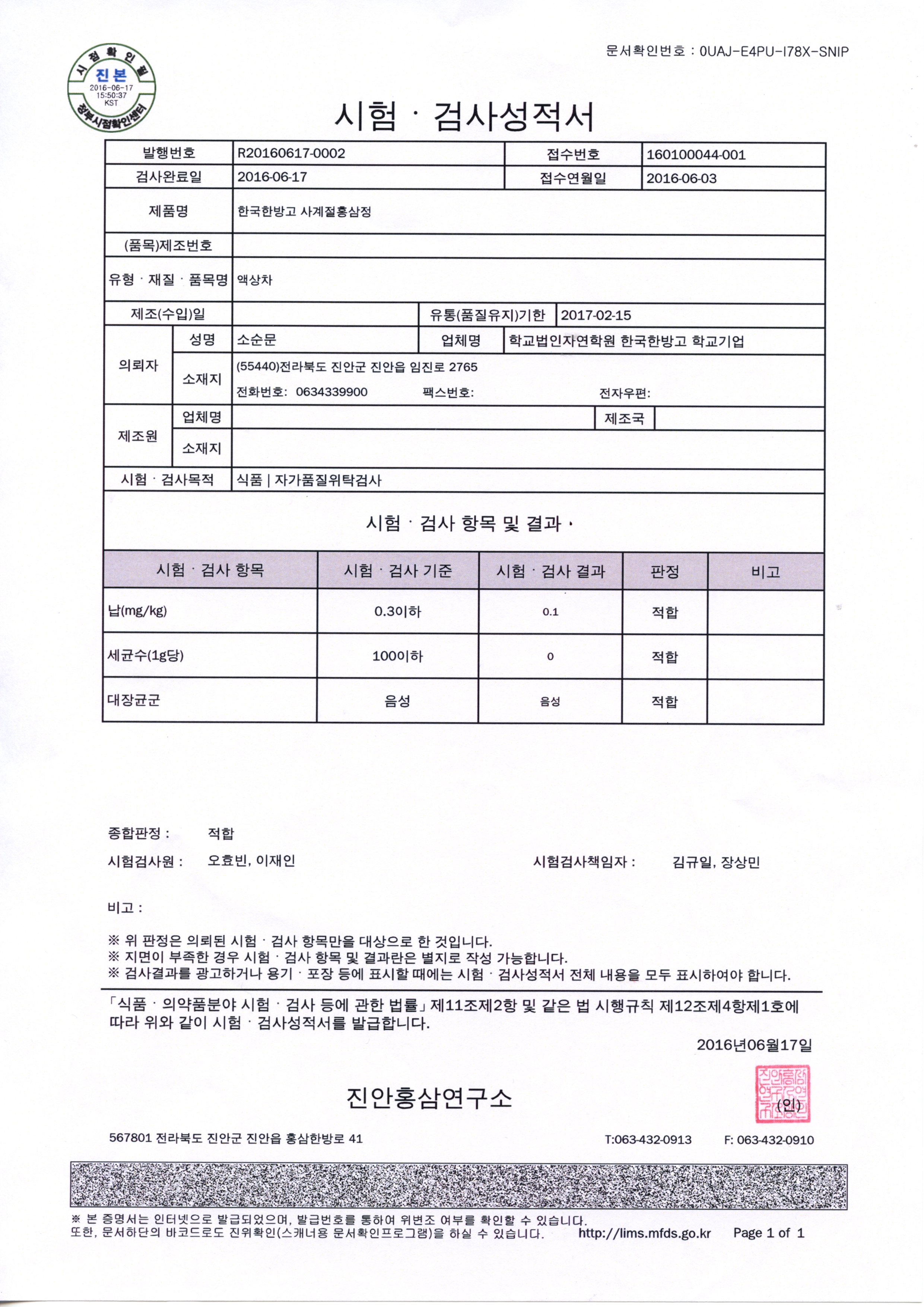 본교에서 생산하는 학교기업 홍삼제품 2016년 자가품질 검사 성적서를 탑재 합니다.
