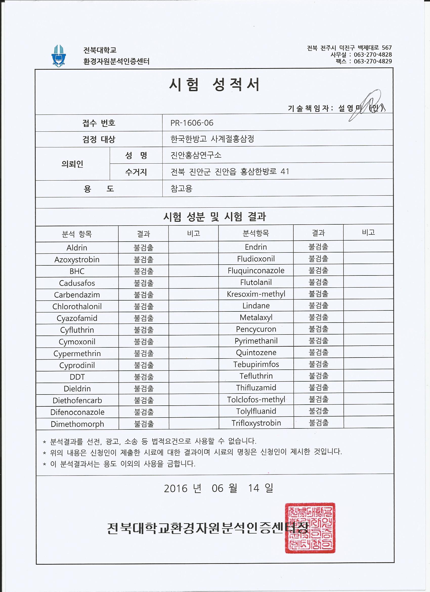 홍삼 원재료 농약잔류 검사서(전북대학교발행)
