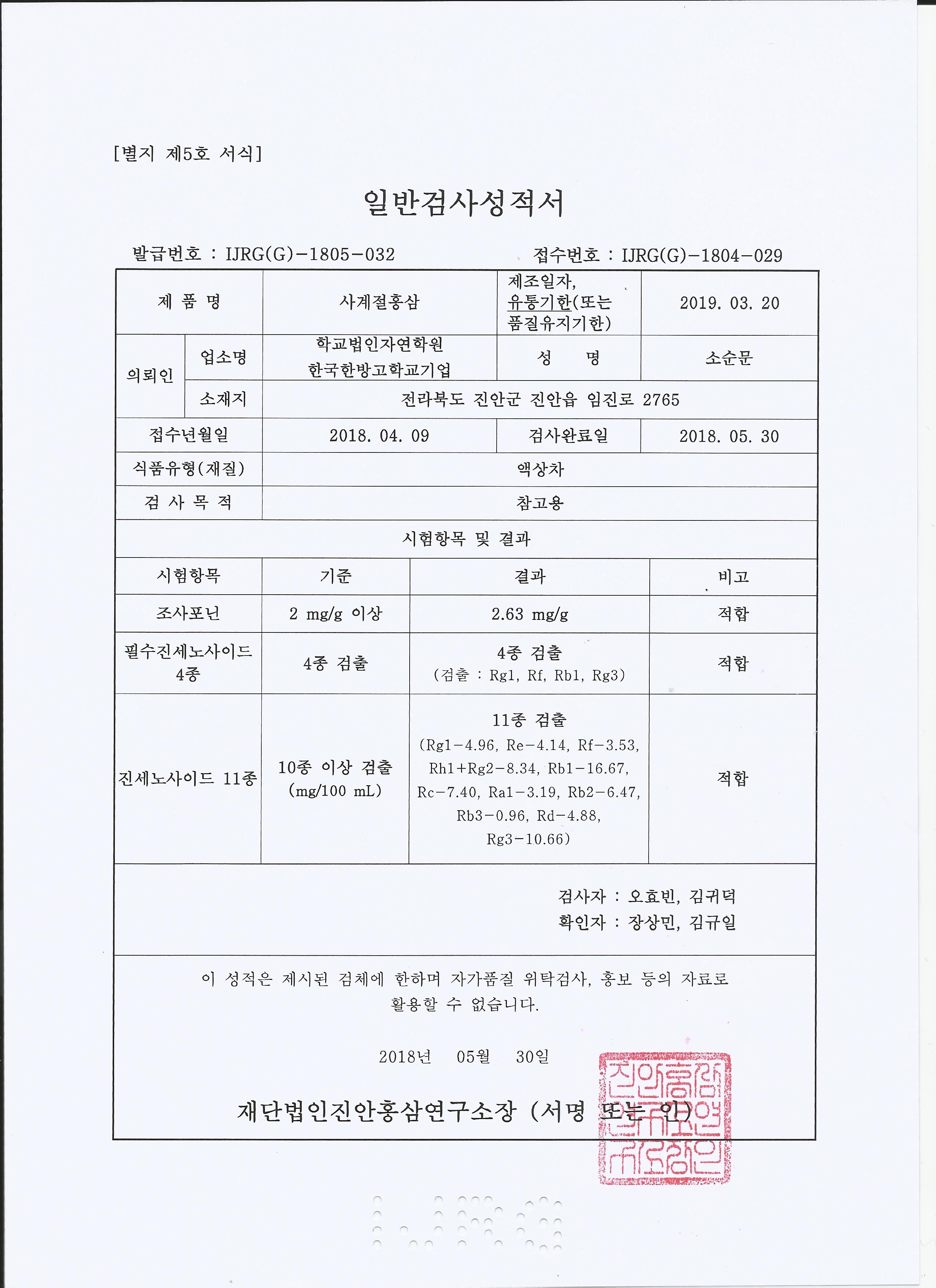 유효 진세노사이드(Rg1+Rb1+Rg3)는 100ml당 32mg로 매우 높은편이네요~