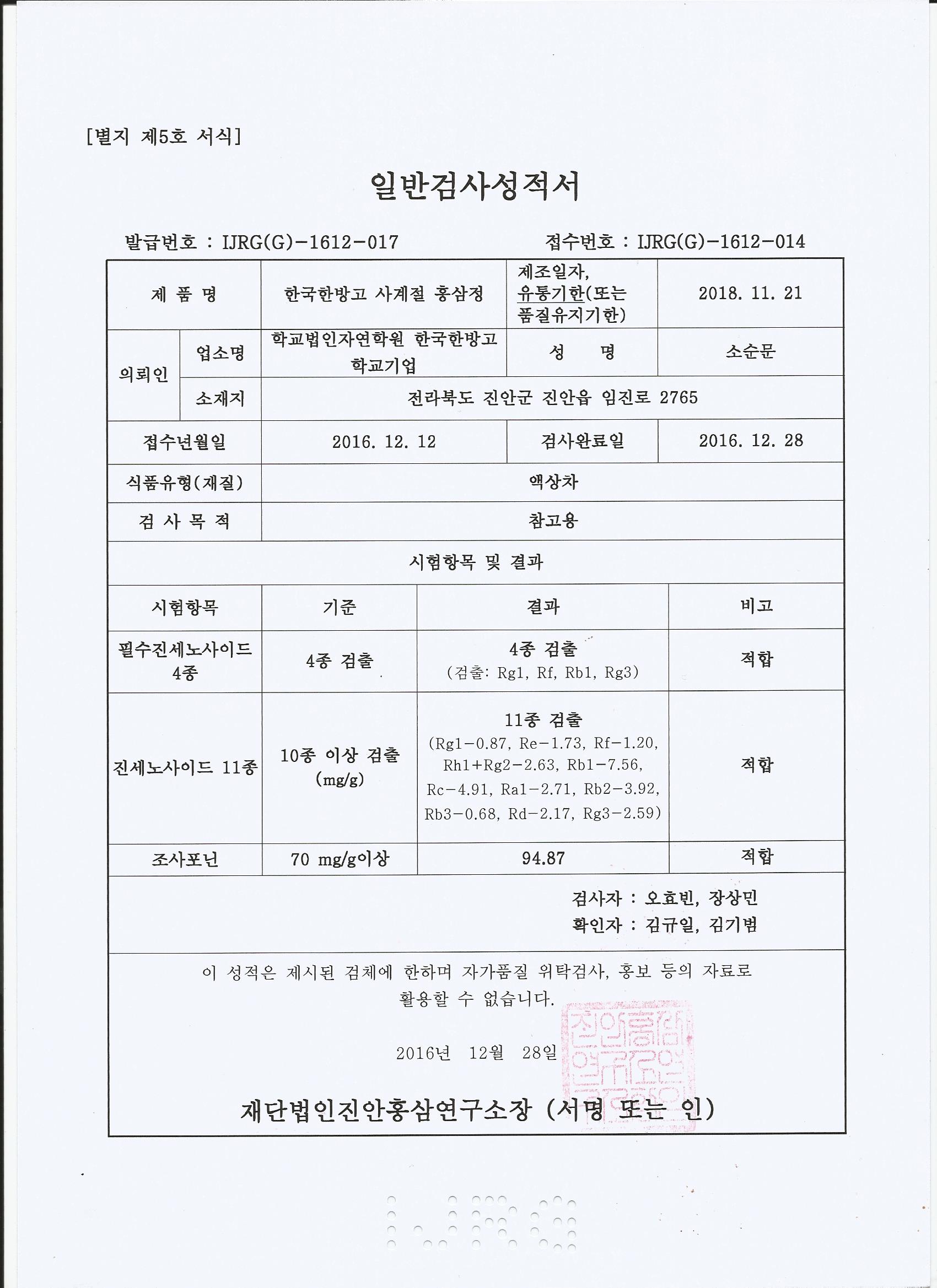 홍삼정(농축액) 성분검사 성적서(홍삼연구소2016.12.28발행)