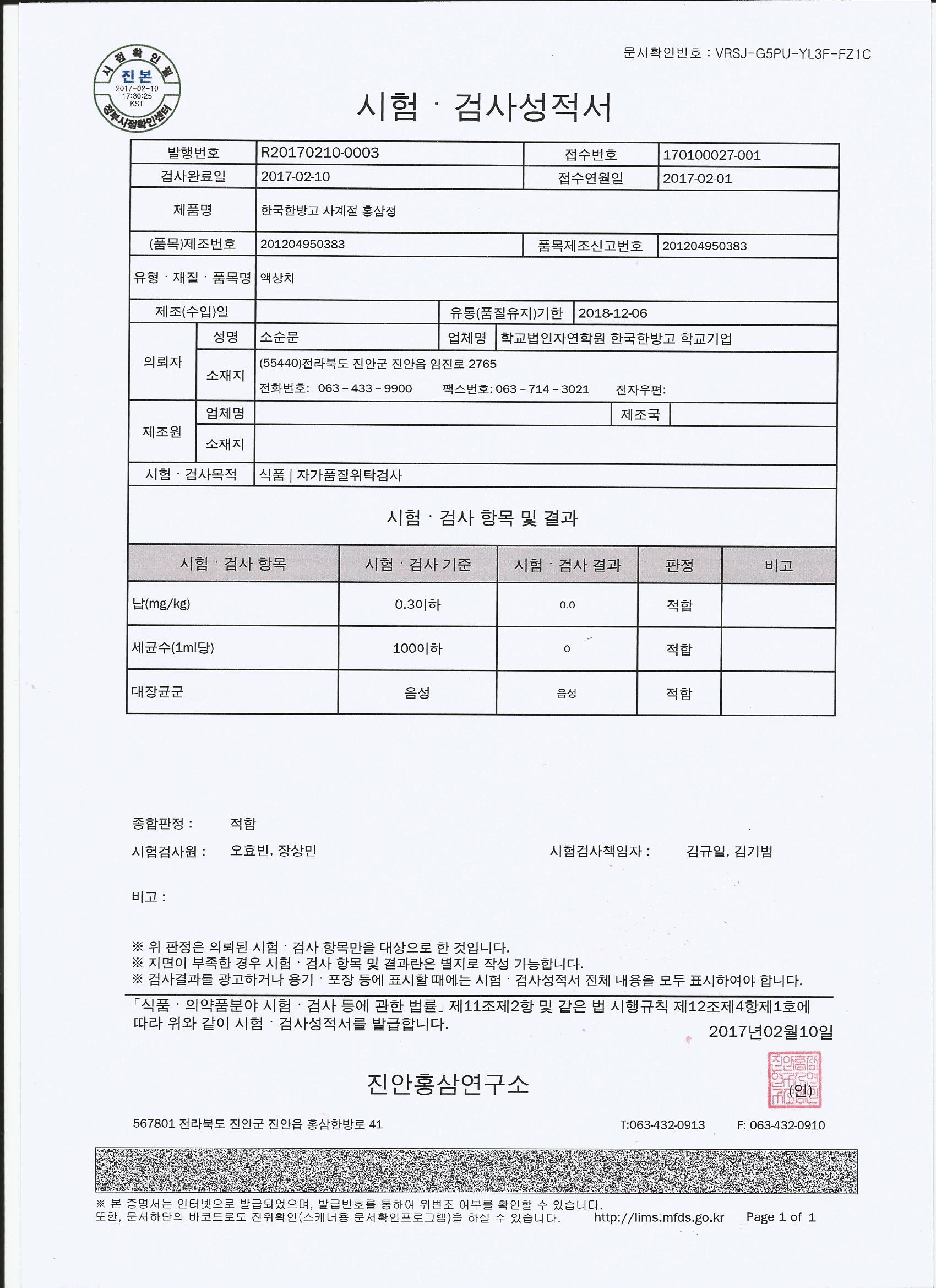 2017 홍삼정 자가품질 성적서(홍삼연구소 발행)